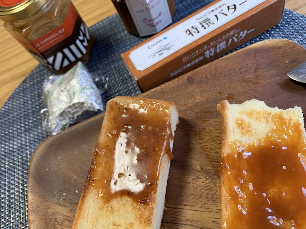 おかしな形だが、同じパンが2つあるわけだし、違うバターを塗って、食べ比べよう!と胸膨らませ、またどのバターを使おうかと散々考えあぐね、結果、カルピスバターの発酵と有塩で、ということに。