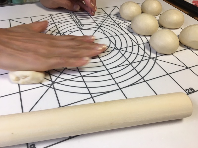 控えめな音を合図に一次発酵まで終わった生地を台に出して8等分にして丸める。