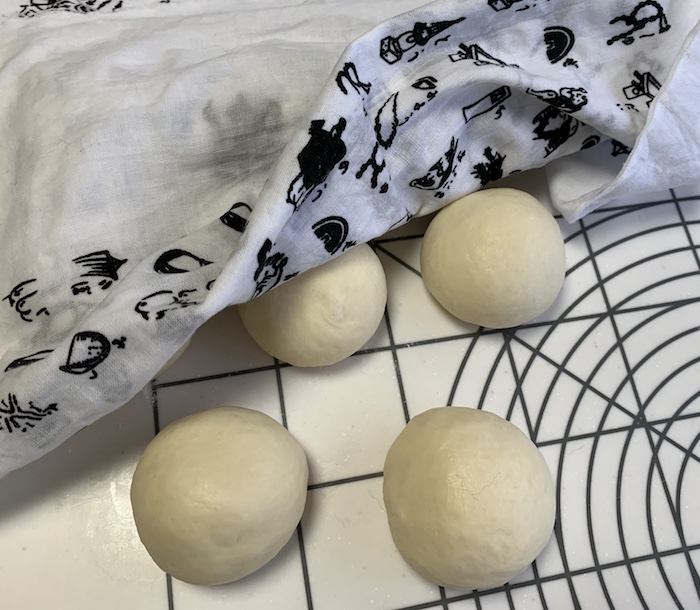 8等分にしてお団子に。乾燥させないように固く絞った濡れ布巾を。ベンチタイムを10分。