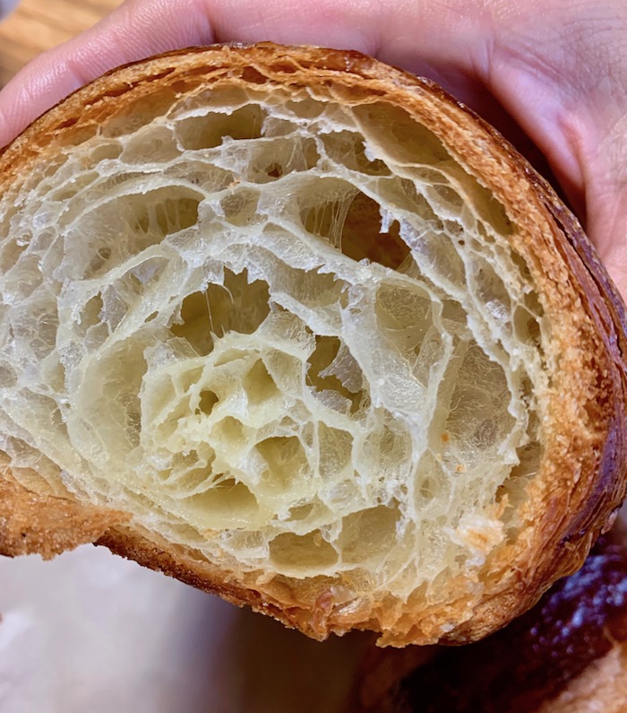 クラムがほんのり黄みがかるも、バター香はしっかりするけれど、ロースト香とでも言おうかカラメルのような焦げた香りの方が口に広がる。
