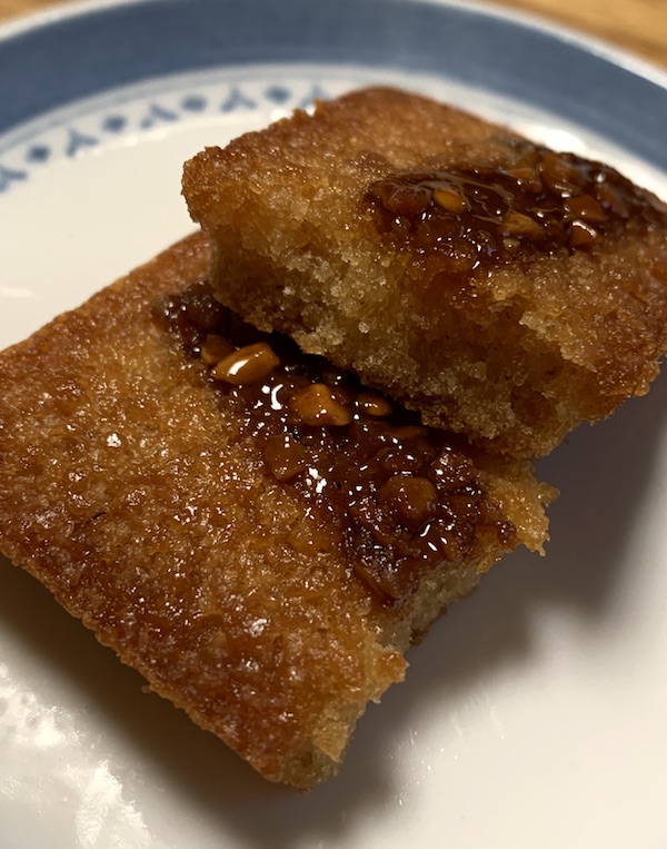 カカオニブが飾られたフィナンシェ。