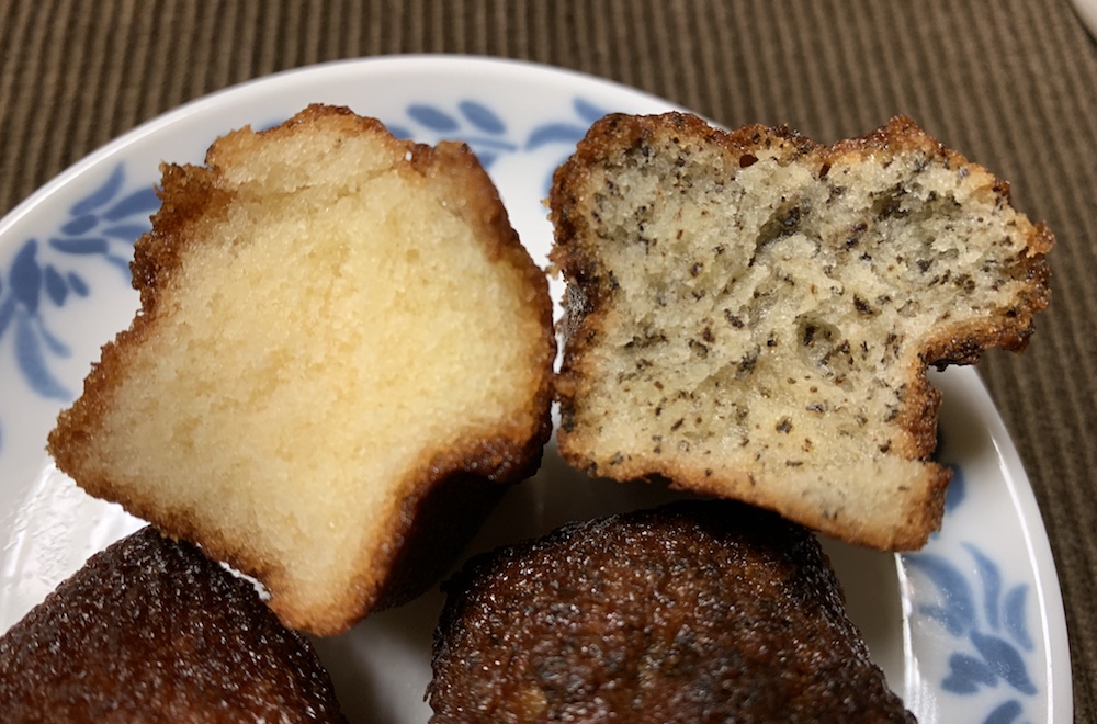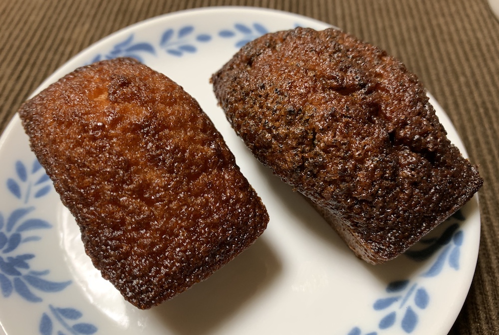 ずんぐりむっくりでかなりこんがり。別々に見たら、どっちも紅茶のフィナンシェだと思いそう…。