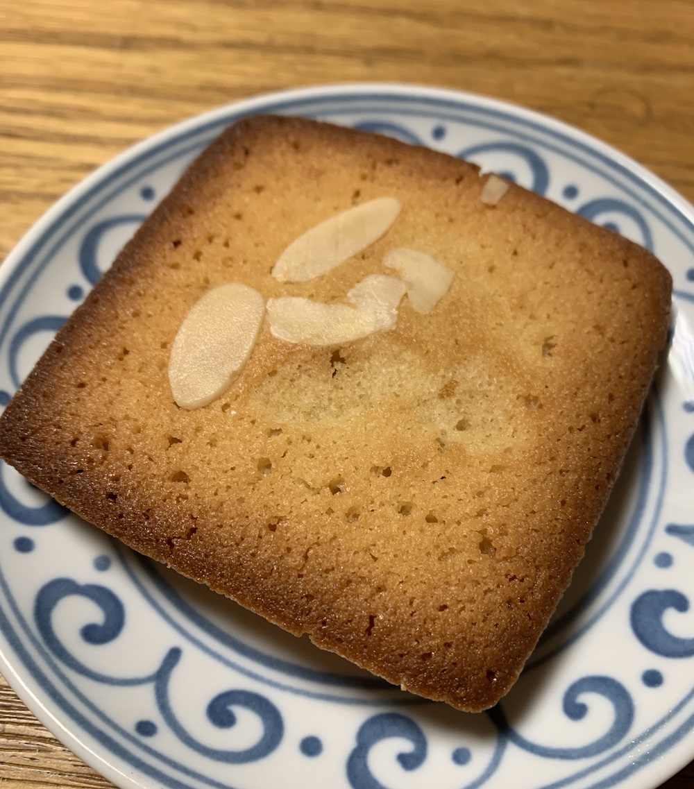 インゴット型ではない四角いフィナンシェ。アーモンドスライスがのっている。