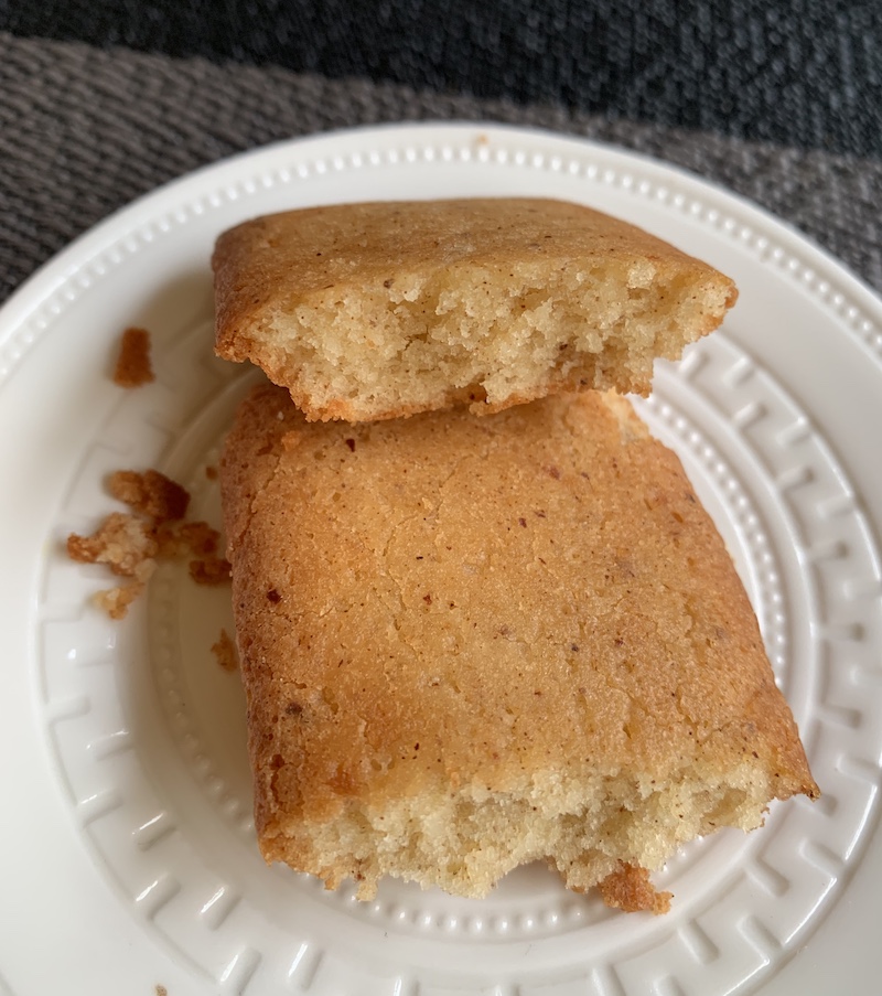 押しつぶしちゃって、ヒビが入った端の方から、少し乾燥してきた気配があるものの、程よいしっとり感や香ばしさは感じられ、最近いただいたプロの味の中でも、かなり好みのフィナンシェでした。